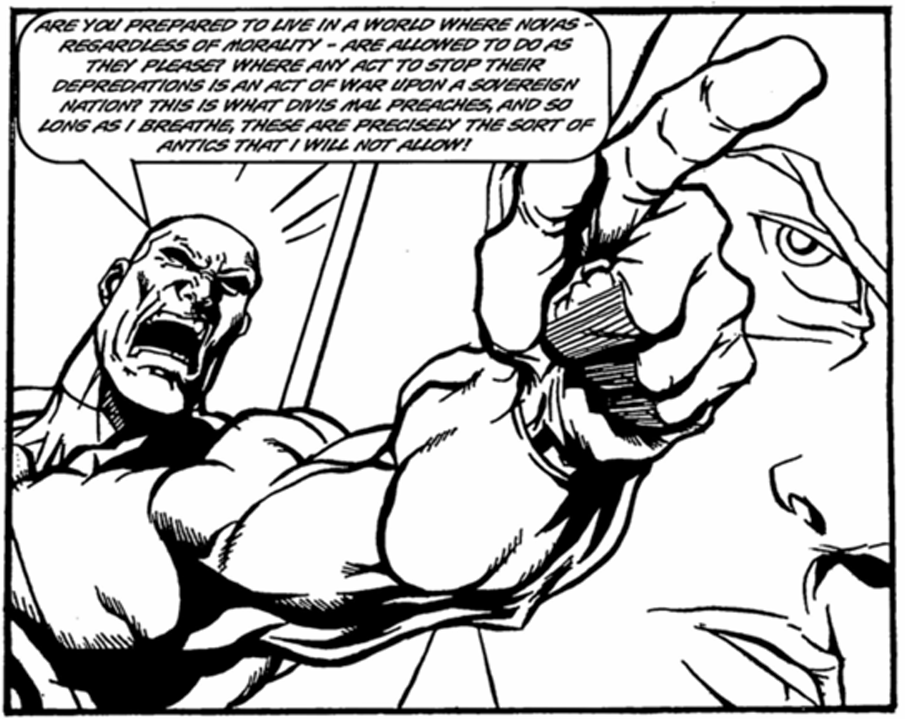 No, I didn’t switch out the speech bubble. We’re genuinely supposed to think that he’s being an evil fascist for saying that novas should be treated as human beings instead of as sovereign powers.
